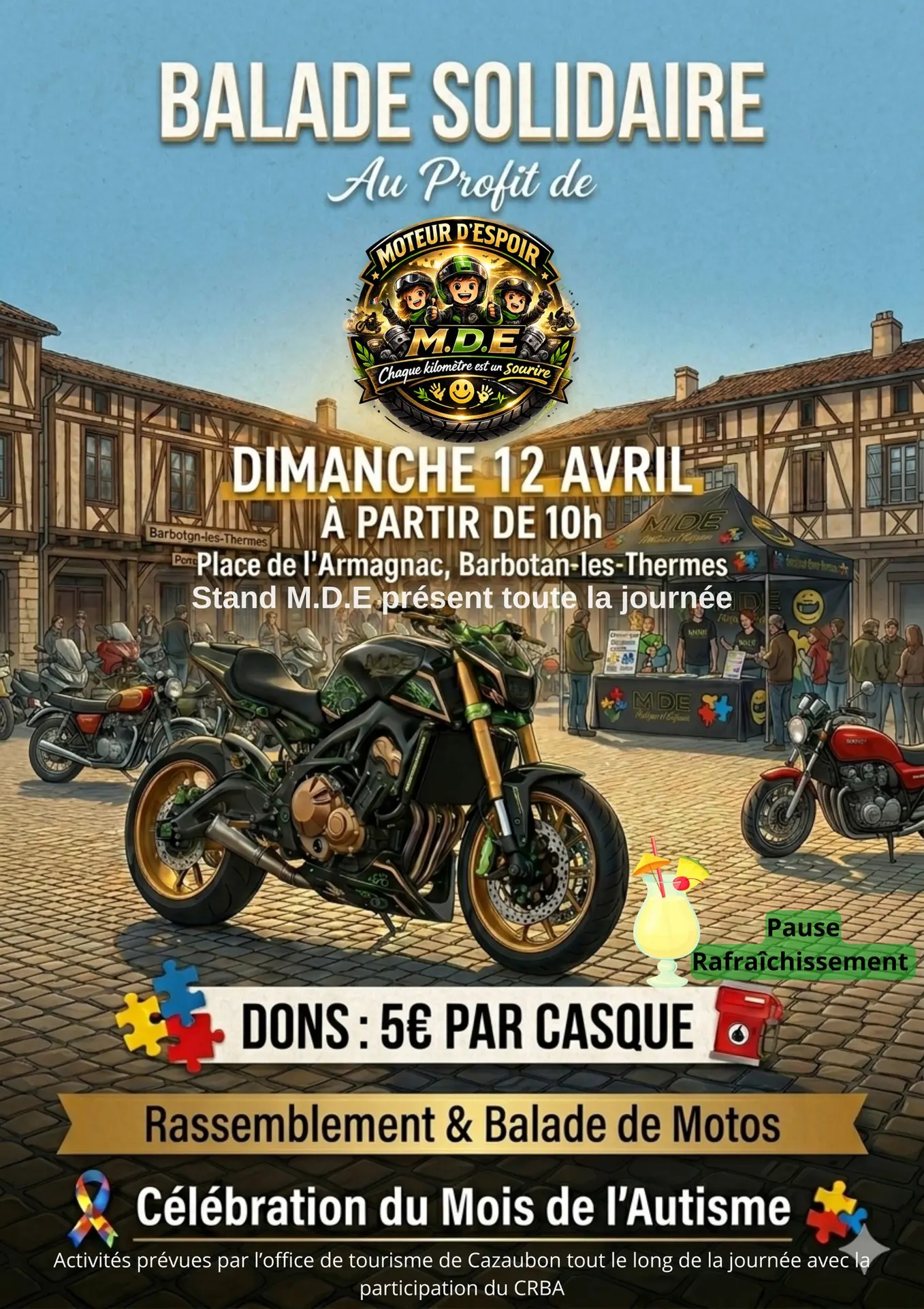 À l’occasion du Mois de l’Autisme, l’association caritative Moteurs d’Espoir de Cazaubon – Barbotan les Thermes, destination reconnue pour son bien être et son accueil chaleureux, organise une balade moto solidaire ouverte à toutes les cylindrées. Une matinée placée sous le signe du soutien, du partage et de la bienveillance, en parallèle du Rassemblement de Véhicules d’Époque sur la Place Armagnac.