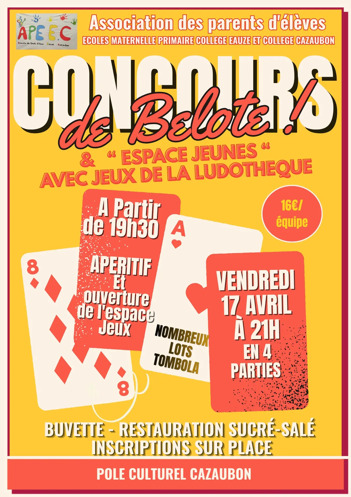 L’Association des Parents d’Élèves organise une soirée conviviale autour d’un grand concours de belote, accompagnée d’un espace jeux animé par la ludothèque pour les plus jeunes.