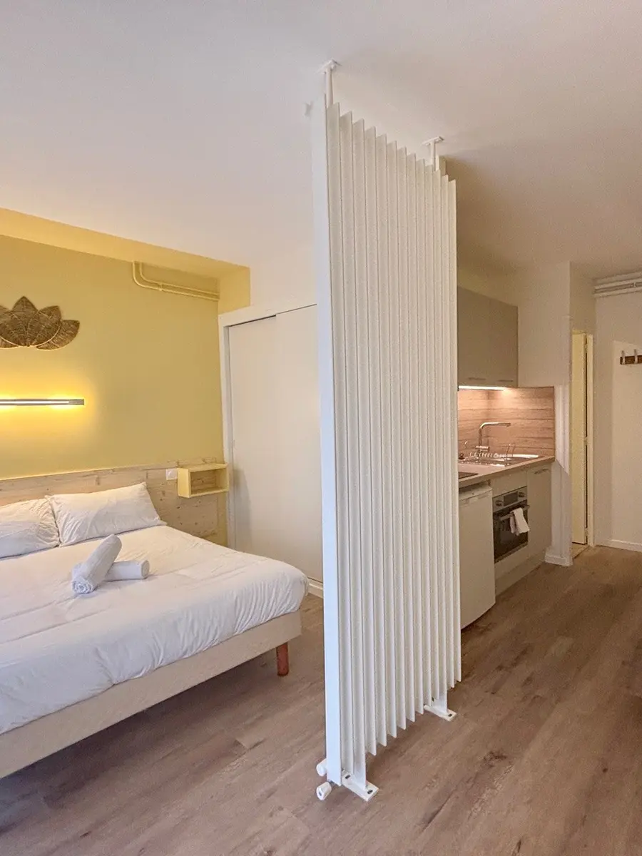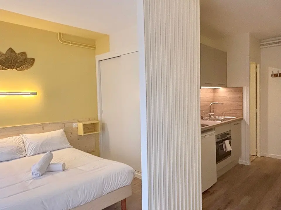 Chaque logement dispose d'une terrasse ou d'un balcon, d'une literie de qualité, d'une décoration soignée et d'un équipement complet (cuisine aménagée, tv connectée, wifi haut débit...)