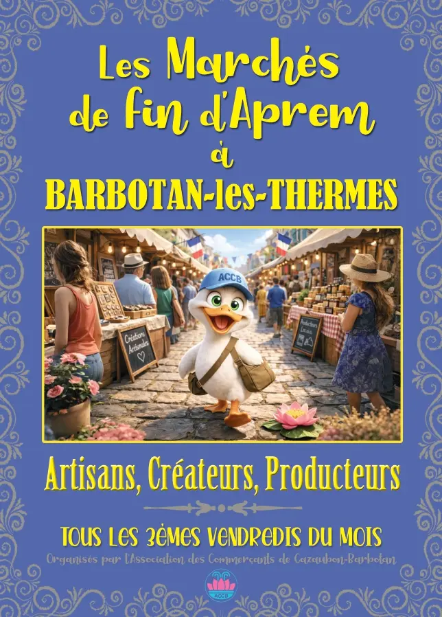 Marché de Fin d'Aprèm' à Barbotan les Thermes tous les 3èmes vendredis des mois d'avril, mai, juin, juillet, aout et septembre 2026, organisés par l'Association des Commerçants, sur la place Armagnac et dans les rues de Barbotan.