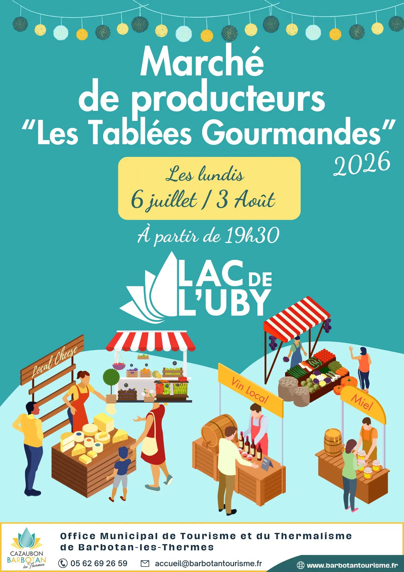 L'Office Municipal de Tourisme et du Thermalisme de Cazaubon – Barbotan-les-Thermes, avec l'appui du réseau Bienvenue à la ferme-Gers, vous propose de nouveau en 2026, 2 marchés gourmands de producteurs " Les Tablées Gourmandes", organisés sur le site du lac de l'Uby à Cazaubon !