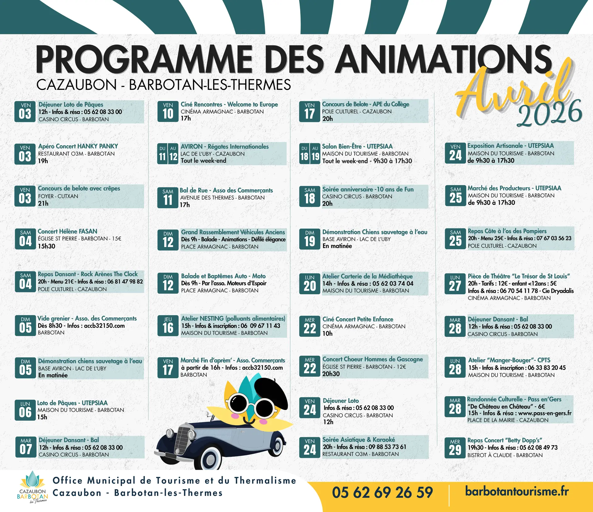 Voici le programme d'animations du mois en cours sur notre destination Slowtourisme de Cazaubon - Barbotan-les-Thermes !