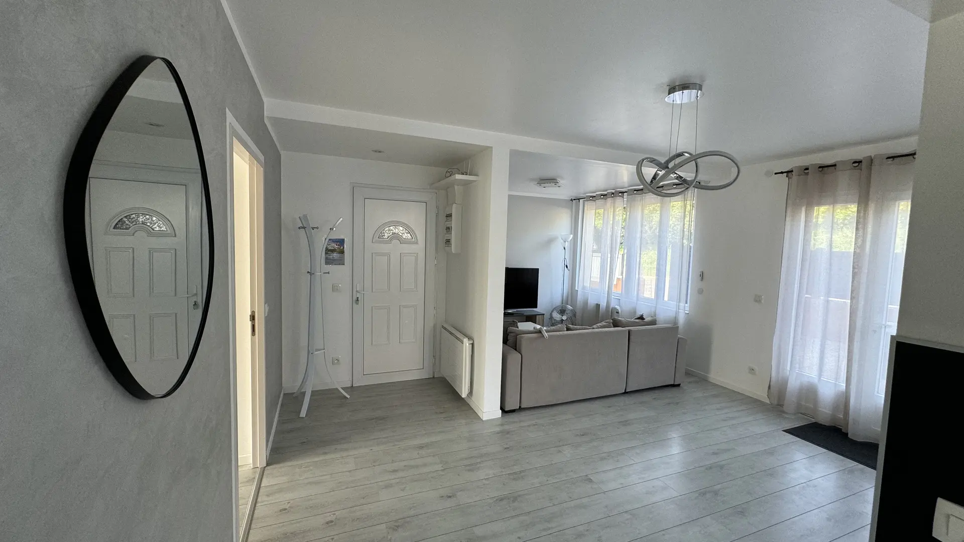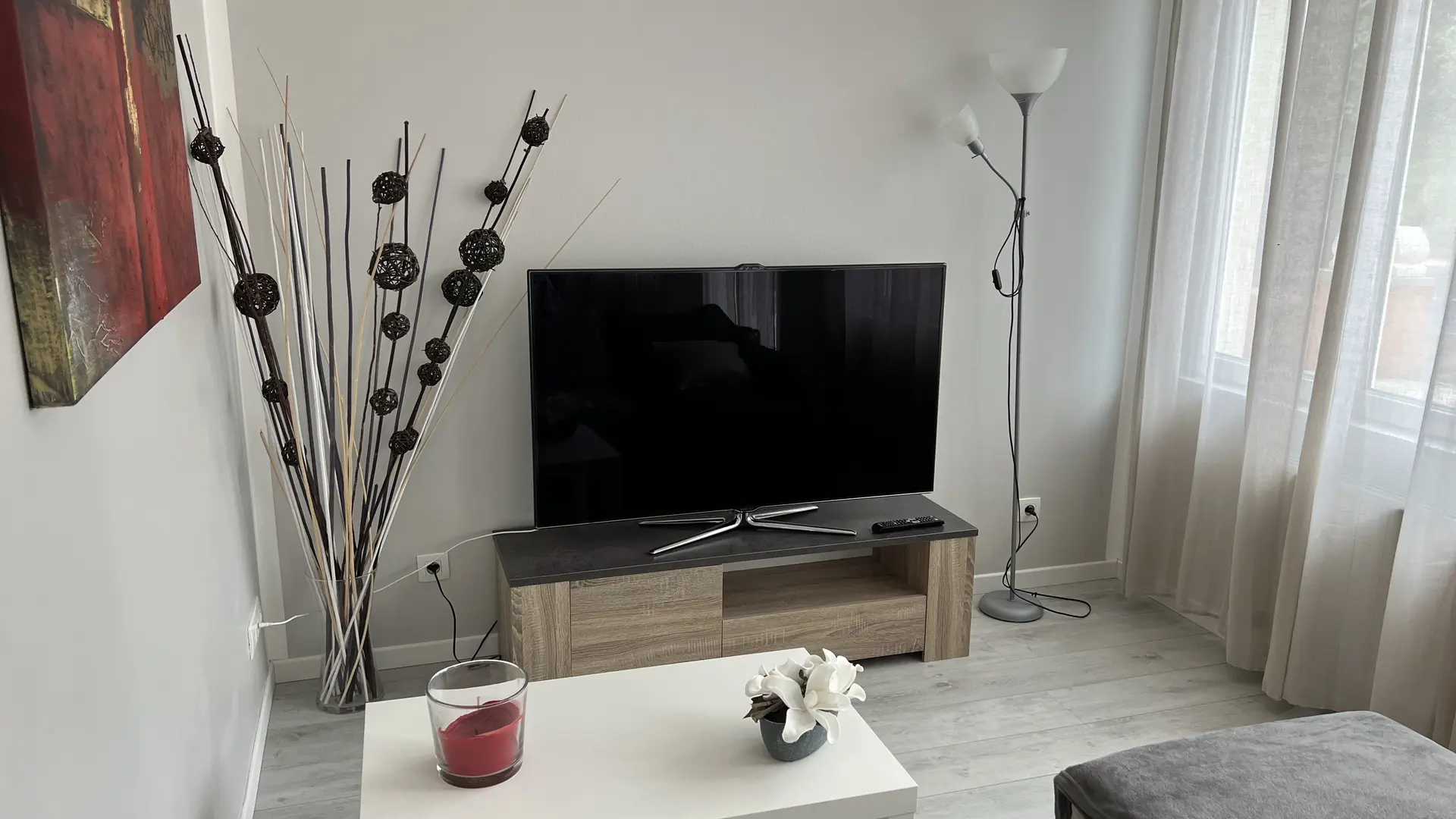 - Salon avec canapé et téléviseur.