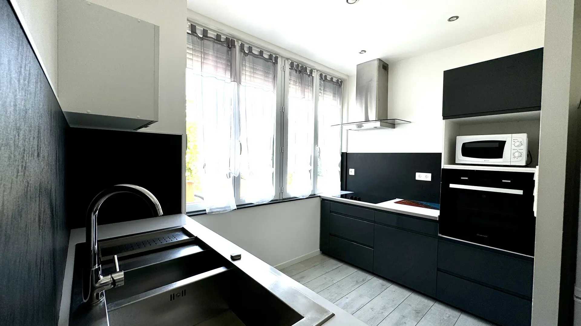 - Cuisine équipée avec plaque électrique, four traditionnel, hotte, four micro-ondes, cafetière traditionnelle et cafetière à dosette, bouilloire, grille pain, ustensiles de cuisine et plongeur, réfrigérateur-congélateur.