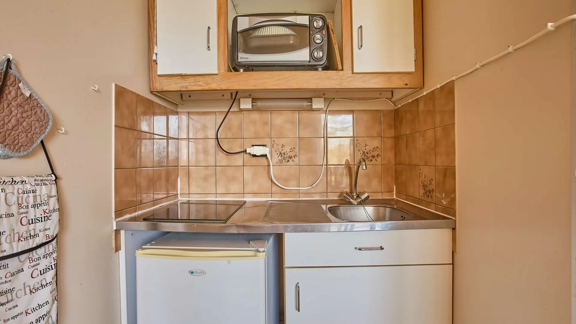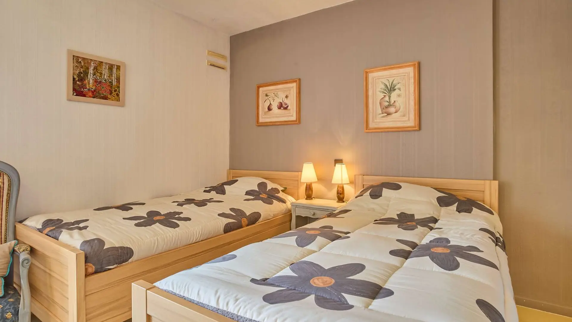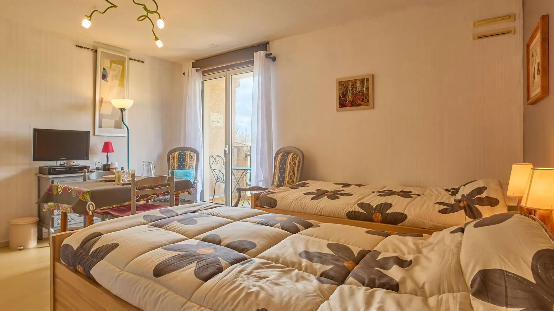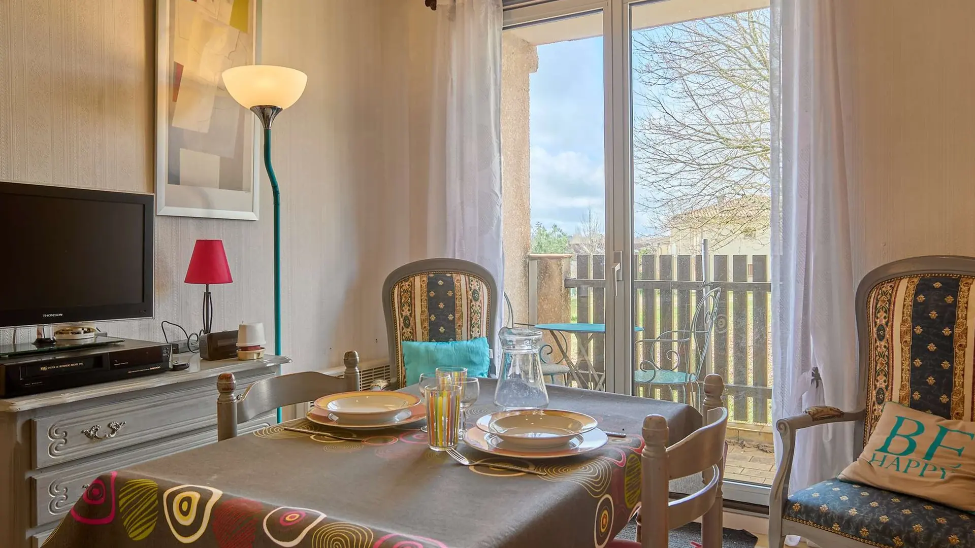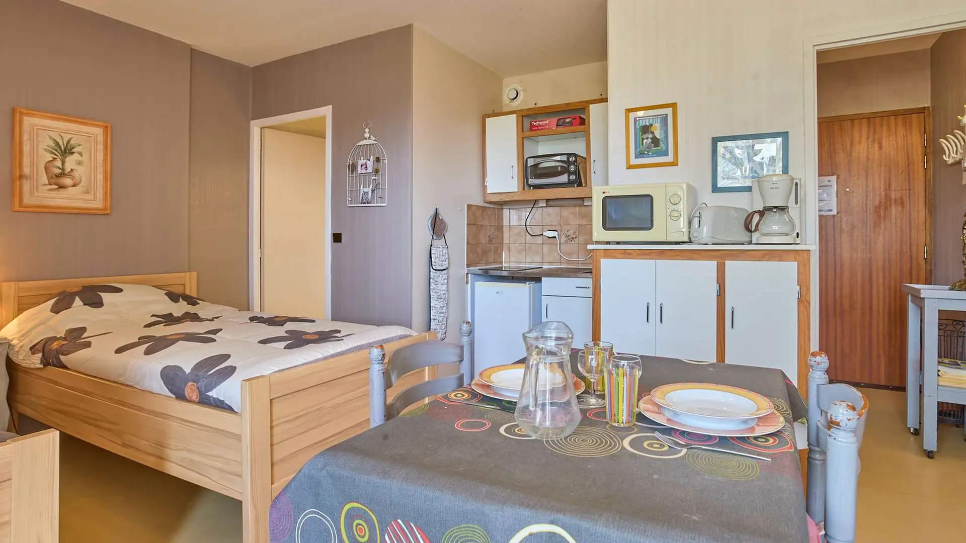 Studio de 24 m², situé au rez-de-chaussée surélevé du bâtiment C de la résidence Henri IV, la pièce principale s’ouvre sur un balcon avec salon de jardin, donnant sur la nature. Elle comprend un coin repas, une cuisine équipée (réfrigérateur, plaques, micro-ondes, four…), un espace salon et un coin nuit avec deux lits de 90 cm. Salle d’eau avec douche, lavabo, sèche serviettes, lave-linge, et WC séparés. Chauffage électrique (avec supplément si forfait 50 € dépassé)